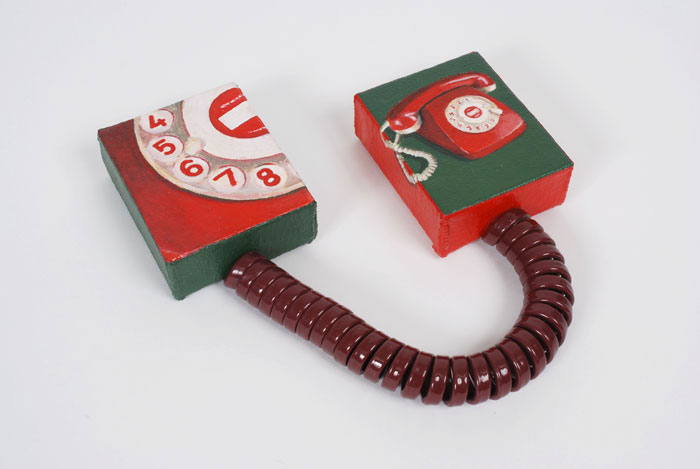 "I Want To Call You On A Tiny Phone", acrylic paint on canvas, telephone cord, shown here actual size
